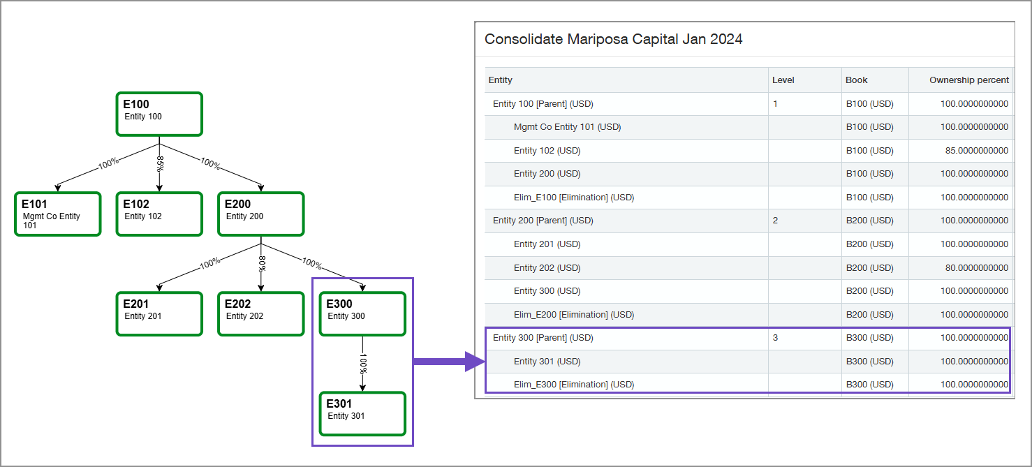 • The remaining activity, such as that between entities E101 and E300, on the E100 reporting book at the top level.