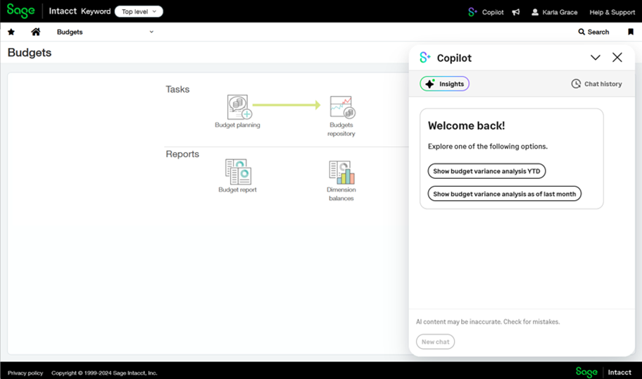The Copilot panel opens on the right side of your browser window on top of the current Intacct page.