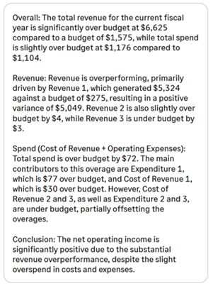 Financial report Shows an example of a financial report displayed using the View full financial report suggested prompt.