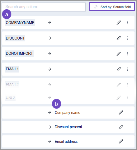 • Destination field, which sorts all fields by the destination field first. This displays the list alphabetically, with the destination field (a) followed by the corresponding source field (b).