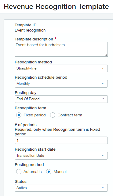 Example of a revenue template using the Event recognition type