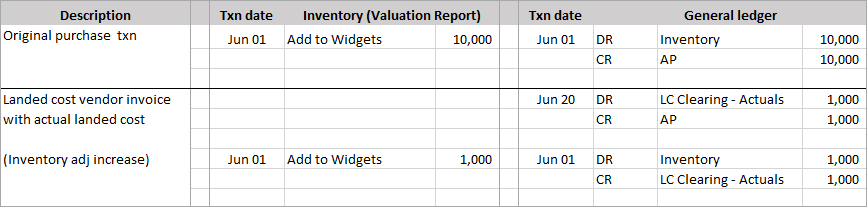 - The date of the system-generated inventory adjustment transaction for the actual landed cost is the date of the original purchase transaction (Jun-01) because the original purchase is still in an open period.