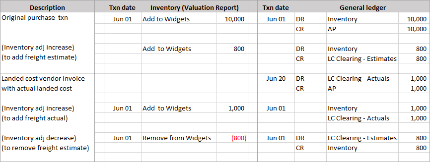 - The date of the system-generated inventory adjustment transactions to add the actual landed cost and remove the estimated cost is the date of the original purchase transaction (Jun-01) because the original purchase is still in an open period.