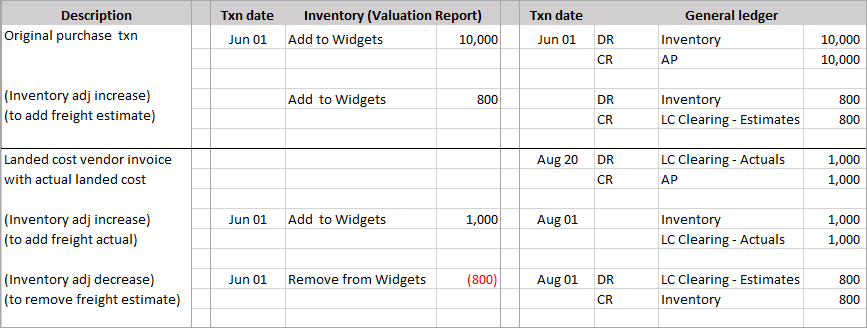 Example 1. Actual landed cost invoiced in same period as original purchase with estimate