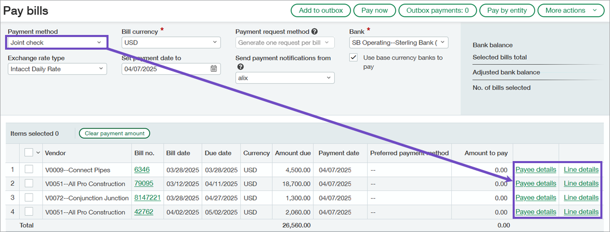 Later, when you pay the bill, you'll enter the amount to pay each joint payee, either at the bill level or the line level.