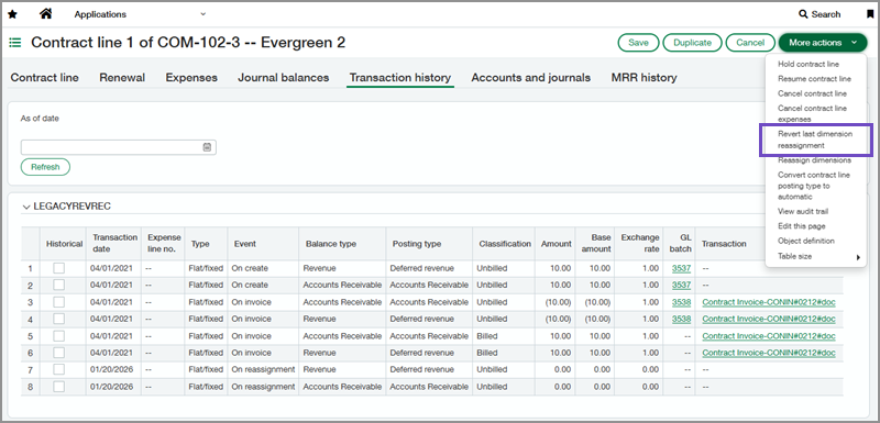 • Reverting a reassignment restores the contract line's previous dimensions, removes the reassignment record from the contract line's transaction history, and deletes the associated General Ledger journal entries.